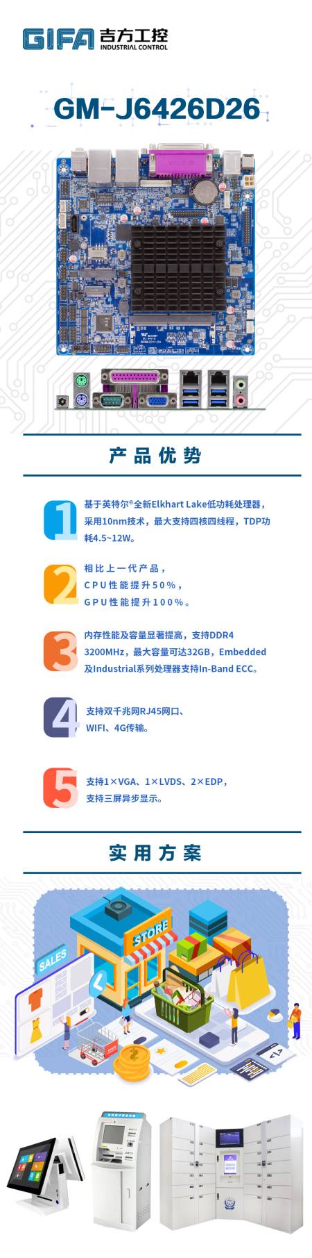 近日,吉方工控推出了適用于零售、自助、一體機、工業控制等行業的主板GM-J6426D26,通過充沛的算力、豐富的擴展接口以及成熟有效的單主機多虛擬機技術,將電子價簽基站、安全監控、自助收款機等眾多數字化設備,以及其中的管理應用和業務數據有機融合在一起,為門店的數字化管理提供了可靠保障。