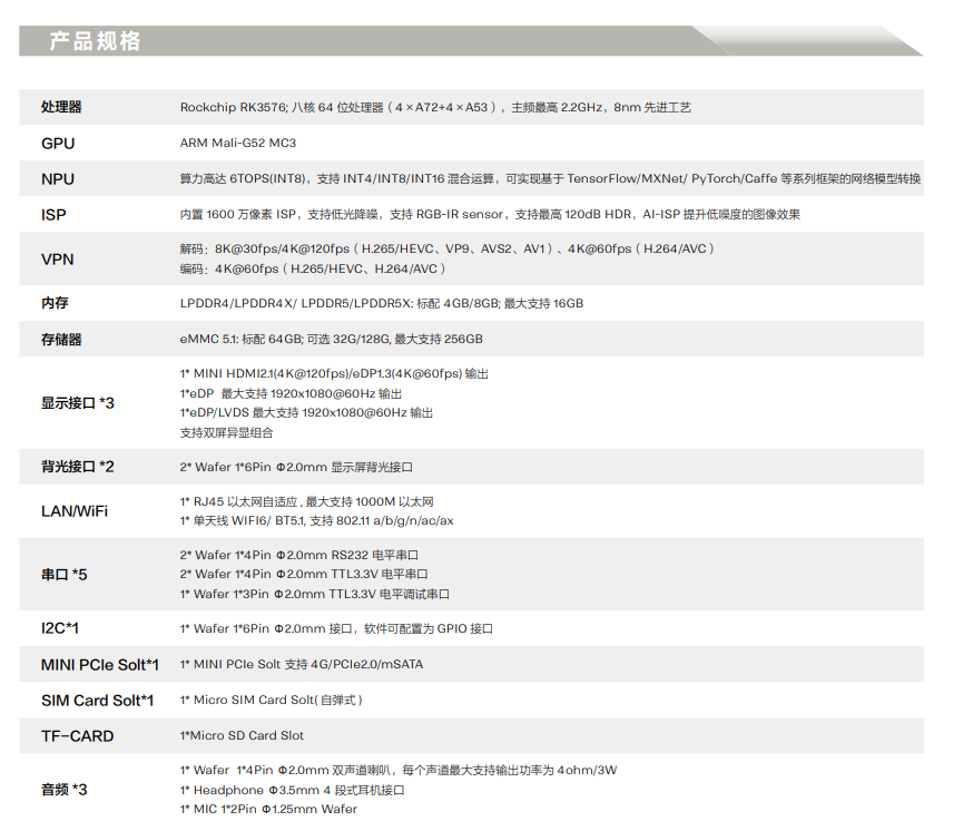 ? 新一代的 AIOT 芯片 RK3576 Quad A72 + Quad A53 CPU 處理器 主頻最高 2.2GHz, 采用 8nm 先進工藝,具有低功耗高性能的特點